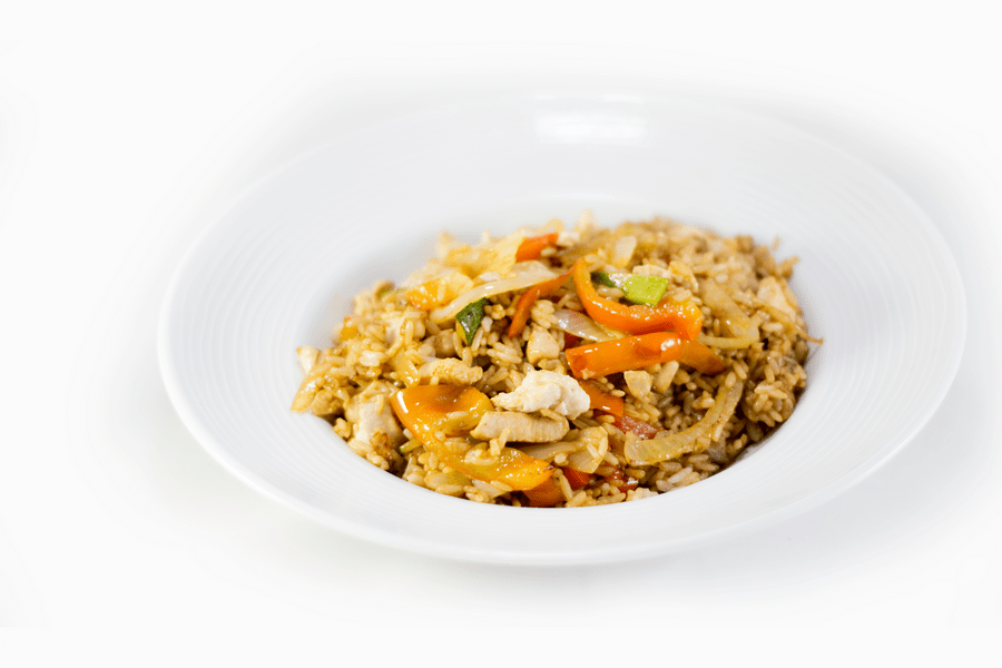 Salteado de pollo, verduras, salsa de soja y arroz.