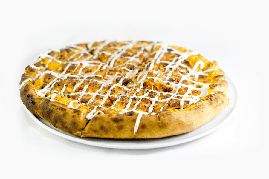 Pizza rellena de cheddar, pepinillo, tiras de hamburguesa, mozzarella, rodajas de tomate y salsa yogurt.